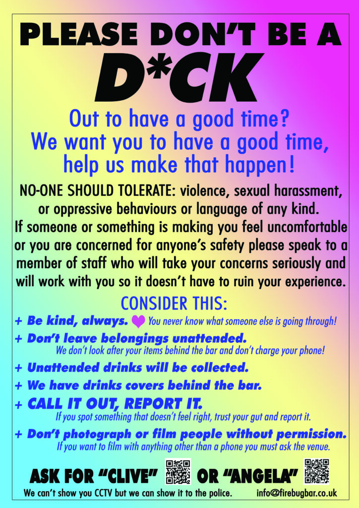 Firebug is signed up to the national ‘Ask for Clive‘ LGBT+ inclusivity campaign for bars, pubs and clubs and the “Ask For Angela” campaign. Everyone is welcome here, but should you encounter anything that makes you uncomfortable or if you witness any kind of abuse, you can ask for Clive and we promise to help.