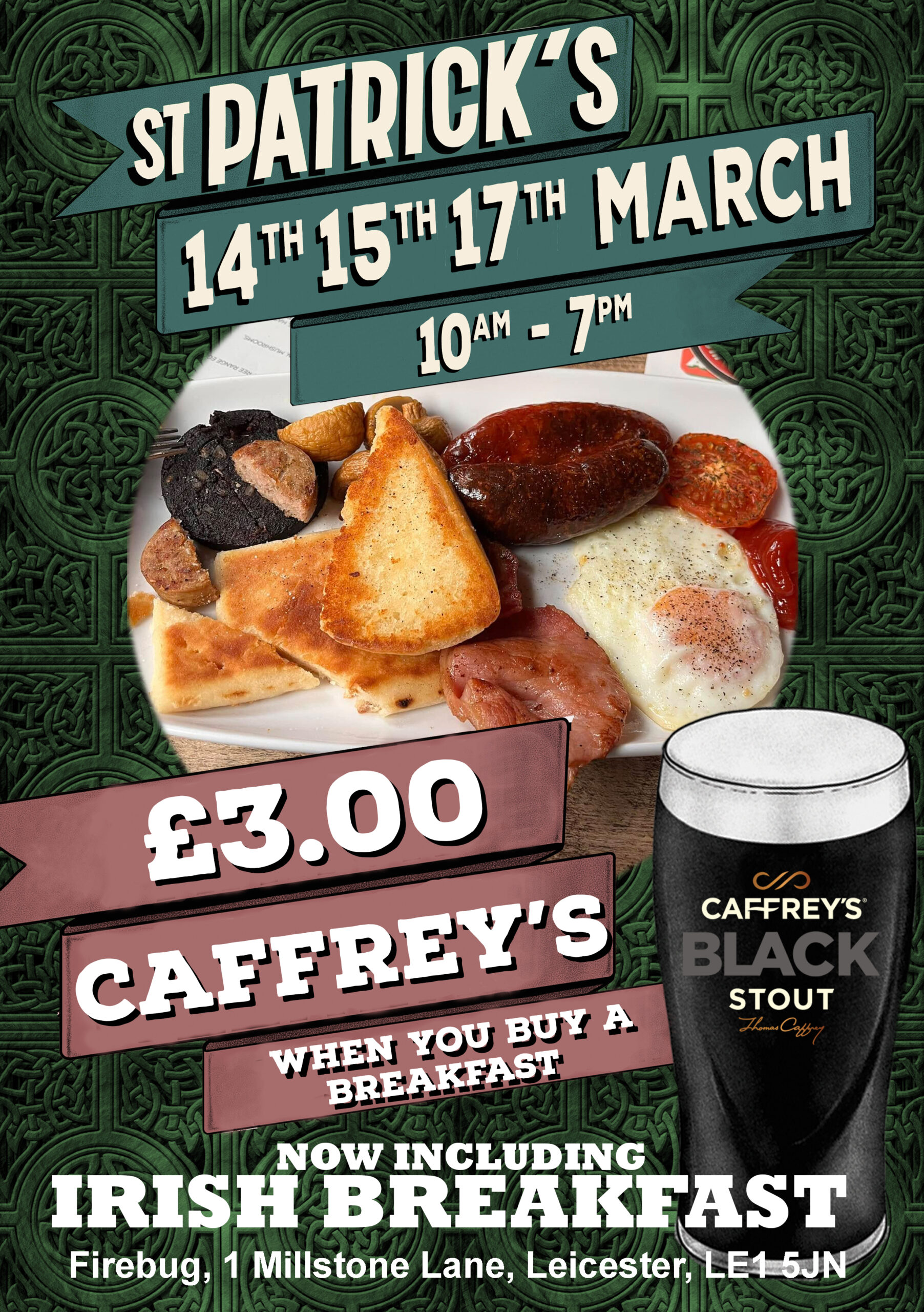 We’re selling Caffrey’s Black Stout for just £4 a pint all day and night 14th, 15th and 17th March PLUS