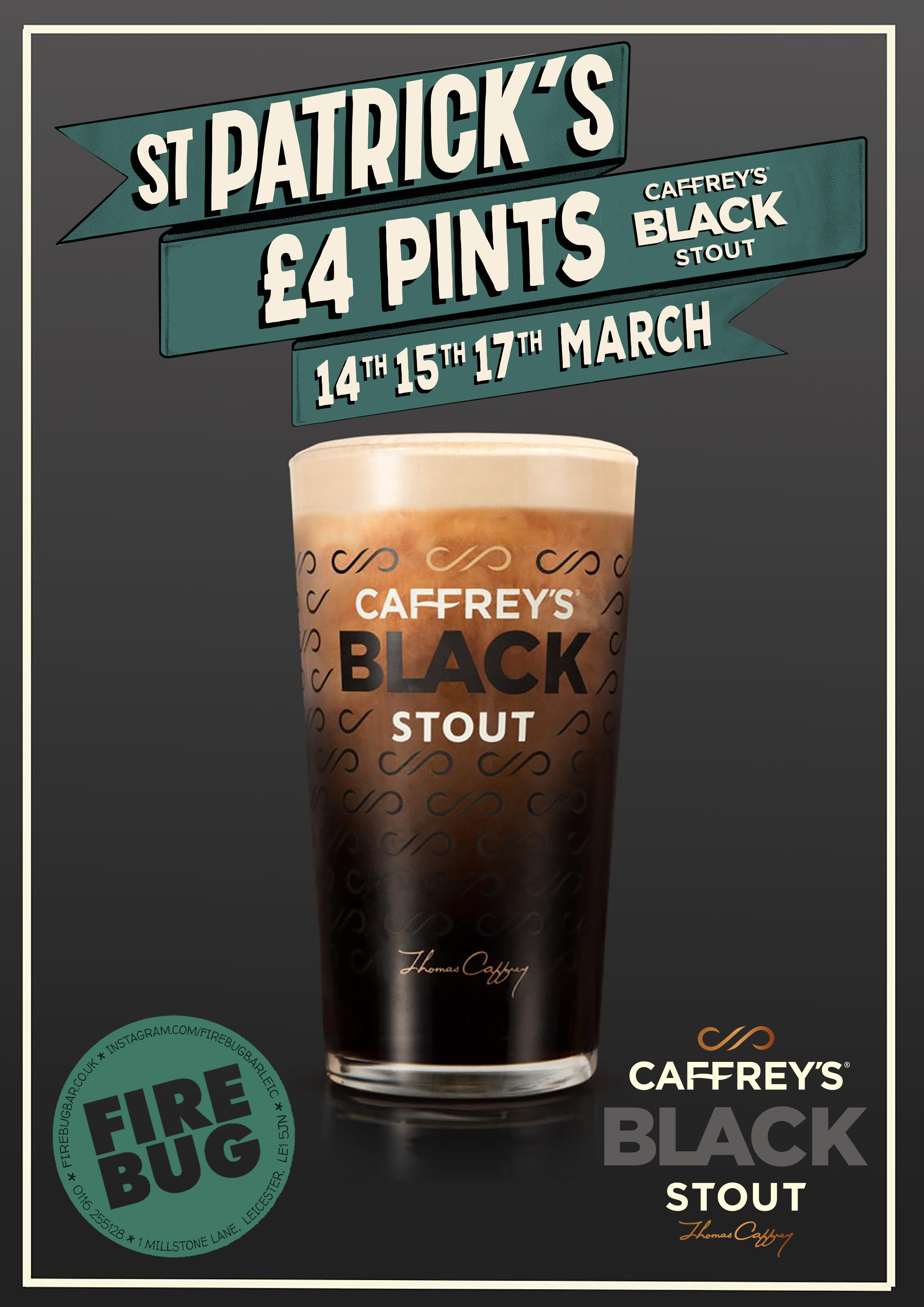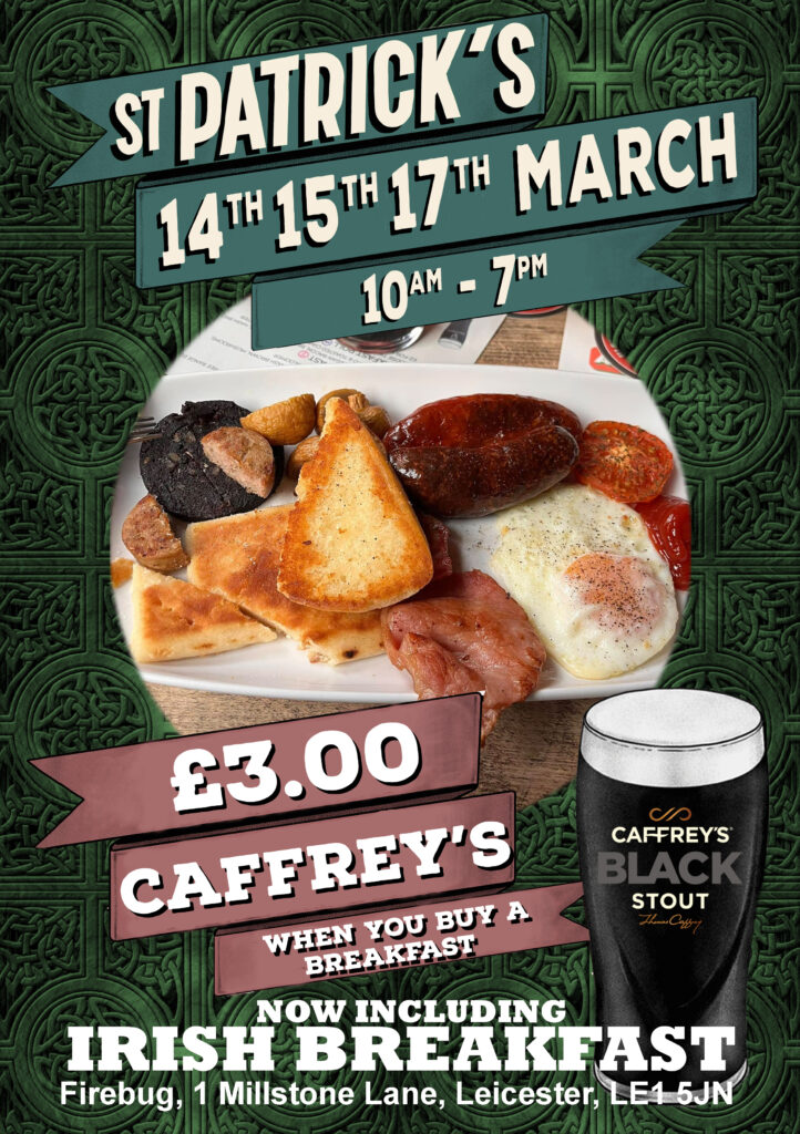 We’re selling Caffrey’s Black Stout for just £4 a pint all day and night 14th, 15th and 17th March PLUS we have all day breakfasts from 10am with Caffrey’s Black Stout at just £3 per pint!!!